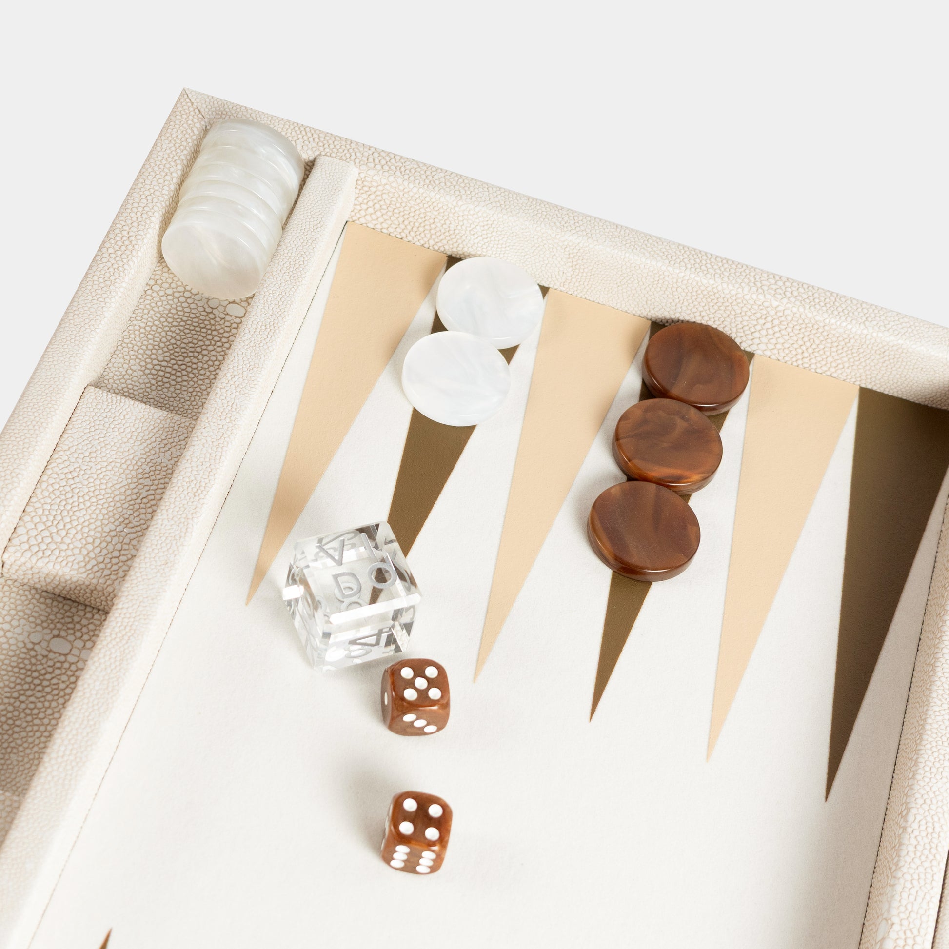 Designed for versatility, the Beige Stingray Medium Backgammon combines a smooth felt playing surface with stingray-textured vegan leather. Its balanced size makes it perfect for both home and travel, while the neutral beige finish delivers refined elegance in a modern, eco-conscious design.