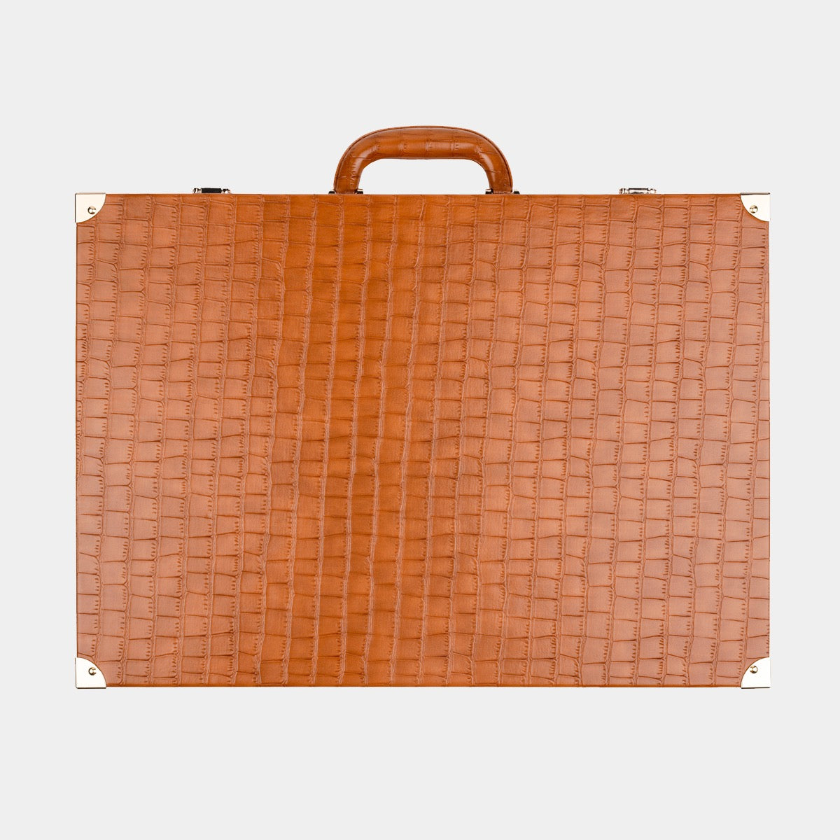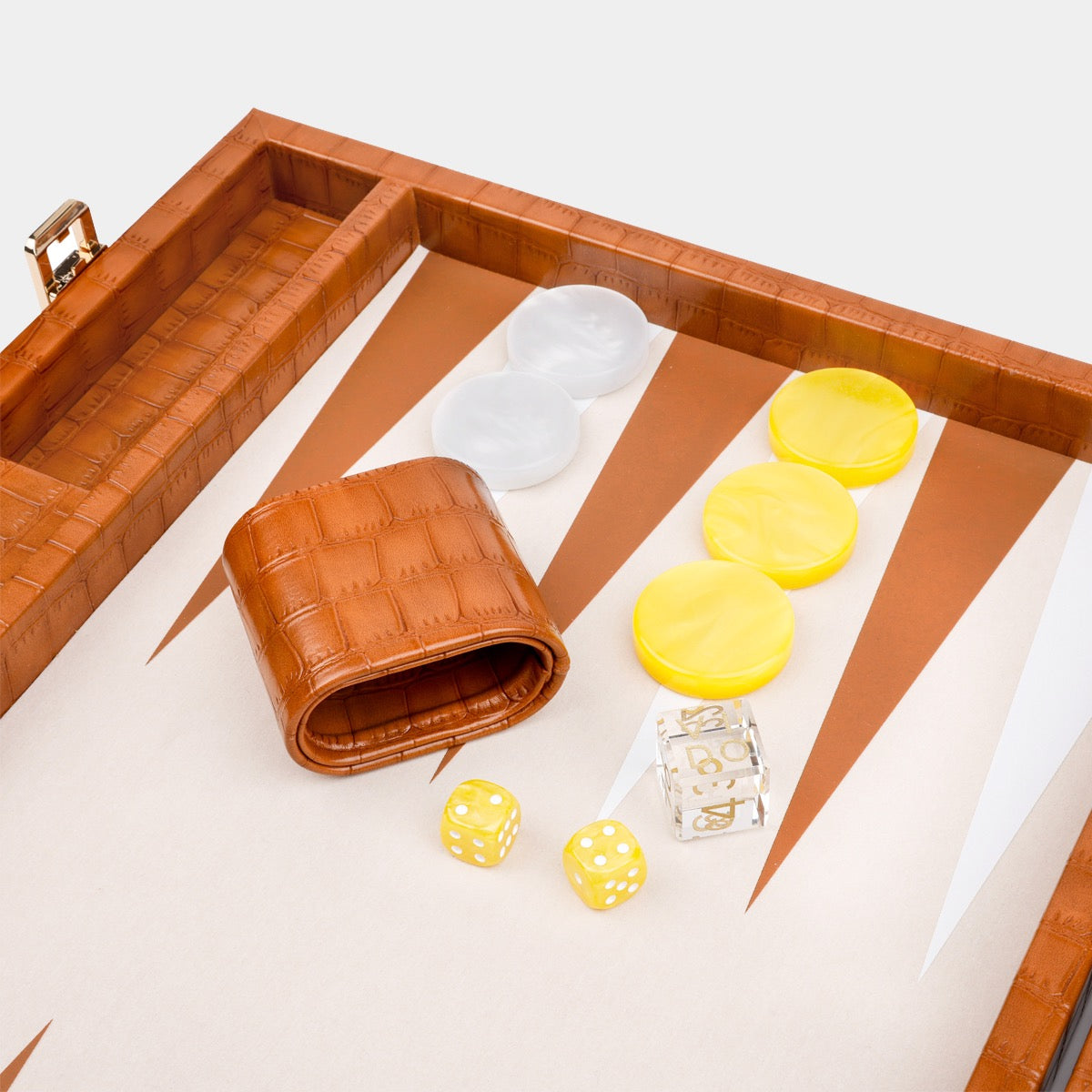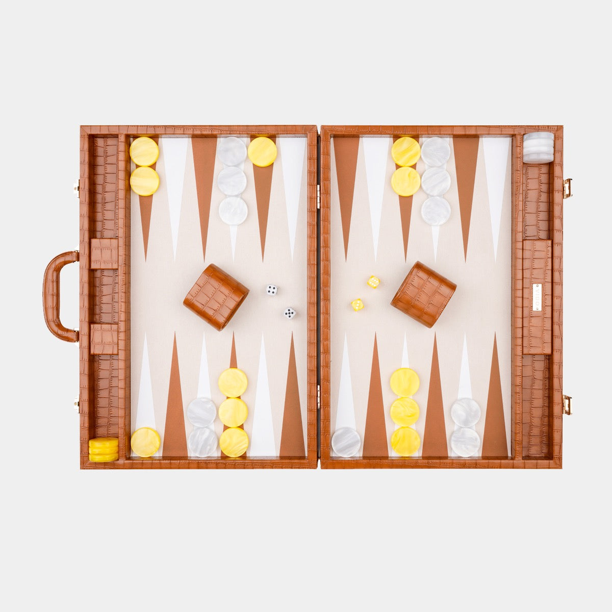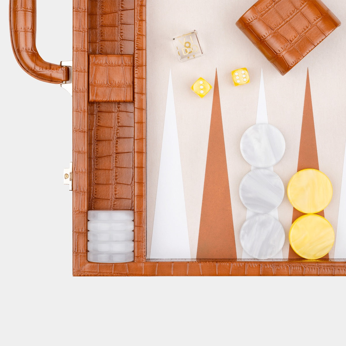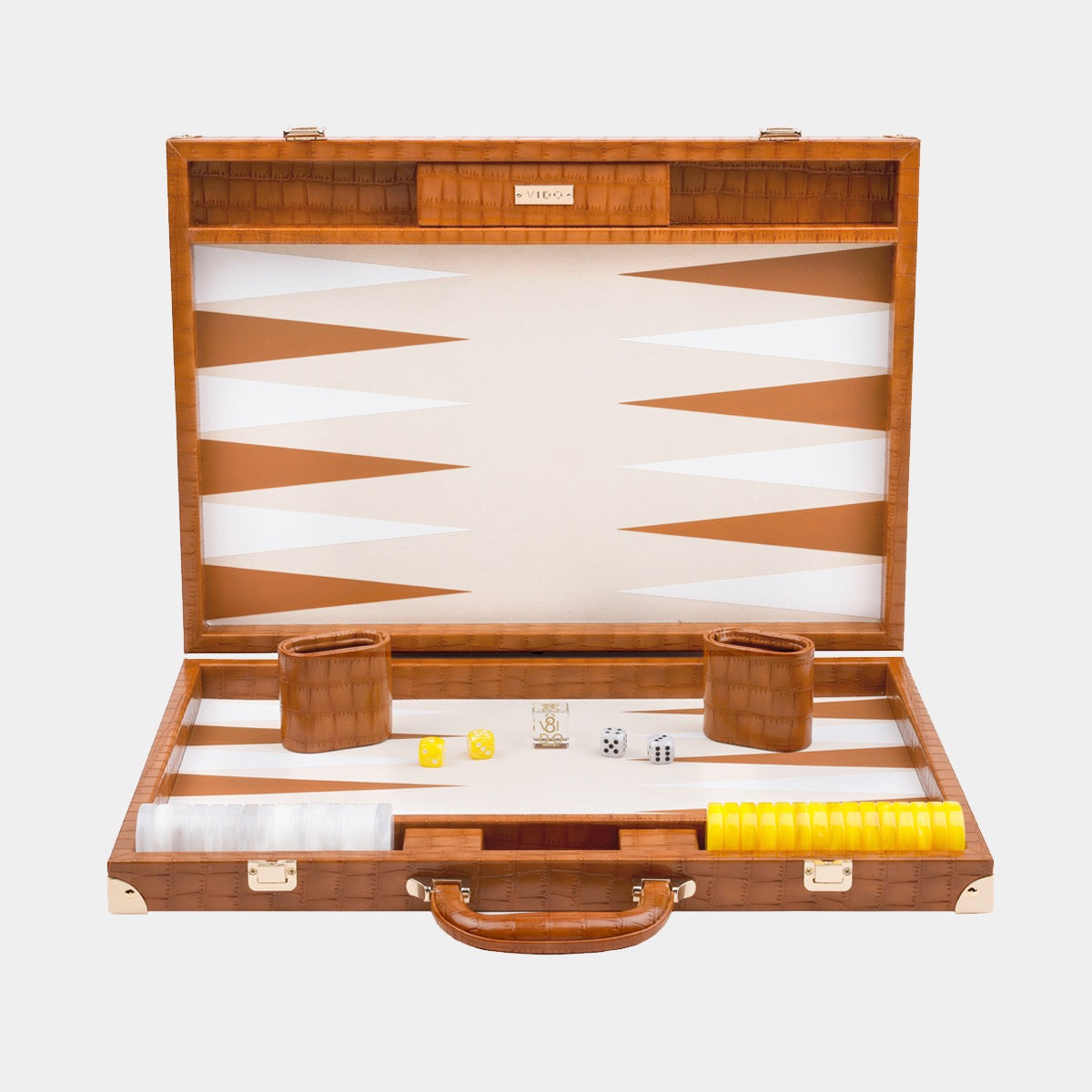 This large backgammon set (51cm) is for the most demanding gamers. A classic competition board, with 44mm checkers and handle, that will look stunning in your living room.Our Chestnut Alligator backgammon set is carefully crafted with vegan leather, premium checkers and dice, and our signature VIDO doubling cube made of genuine crystal.