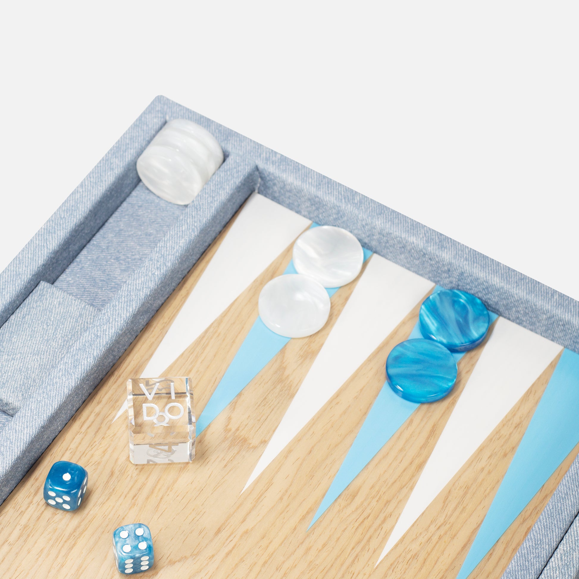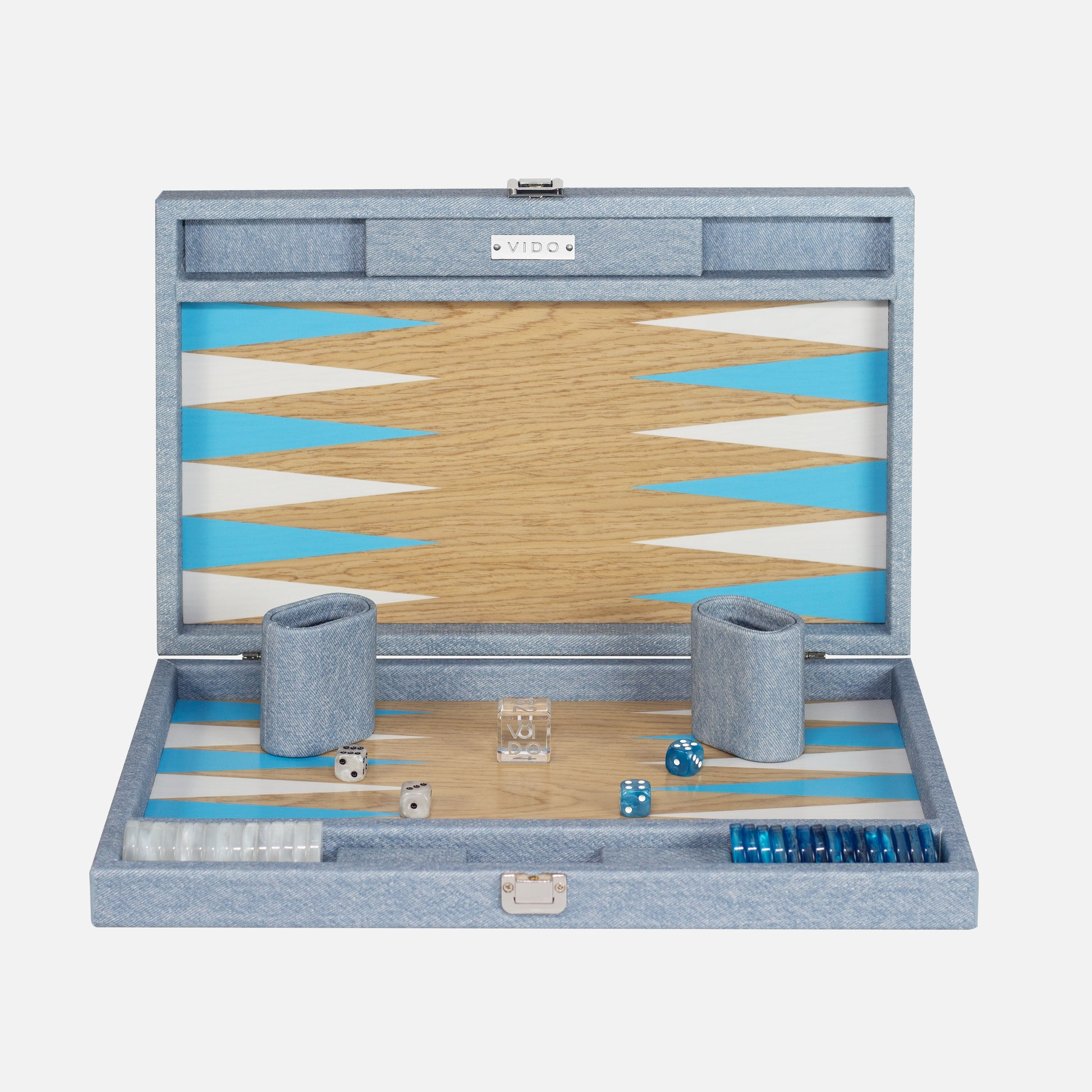 The denim blue tone offers a modern twist that stands out without losing the classic elegance of backgammon. Crafted for durability and portability, it’s perfect for both home play and travel, ensuring every match is as enjoyable as it is stylish. Whether for a casual game night or a competitive tournament, this backgammon set delivers a premium playing experience.