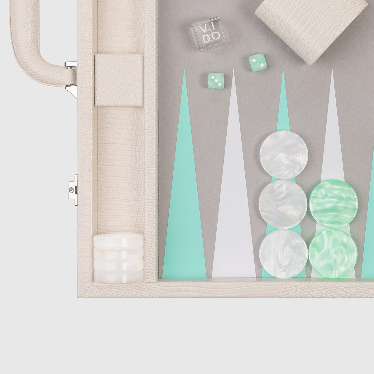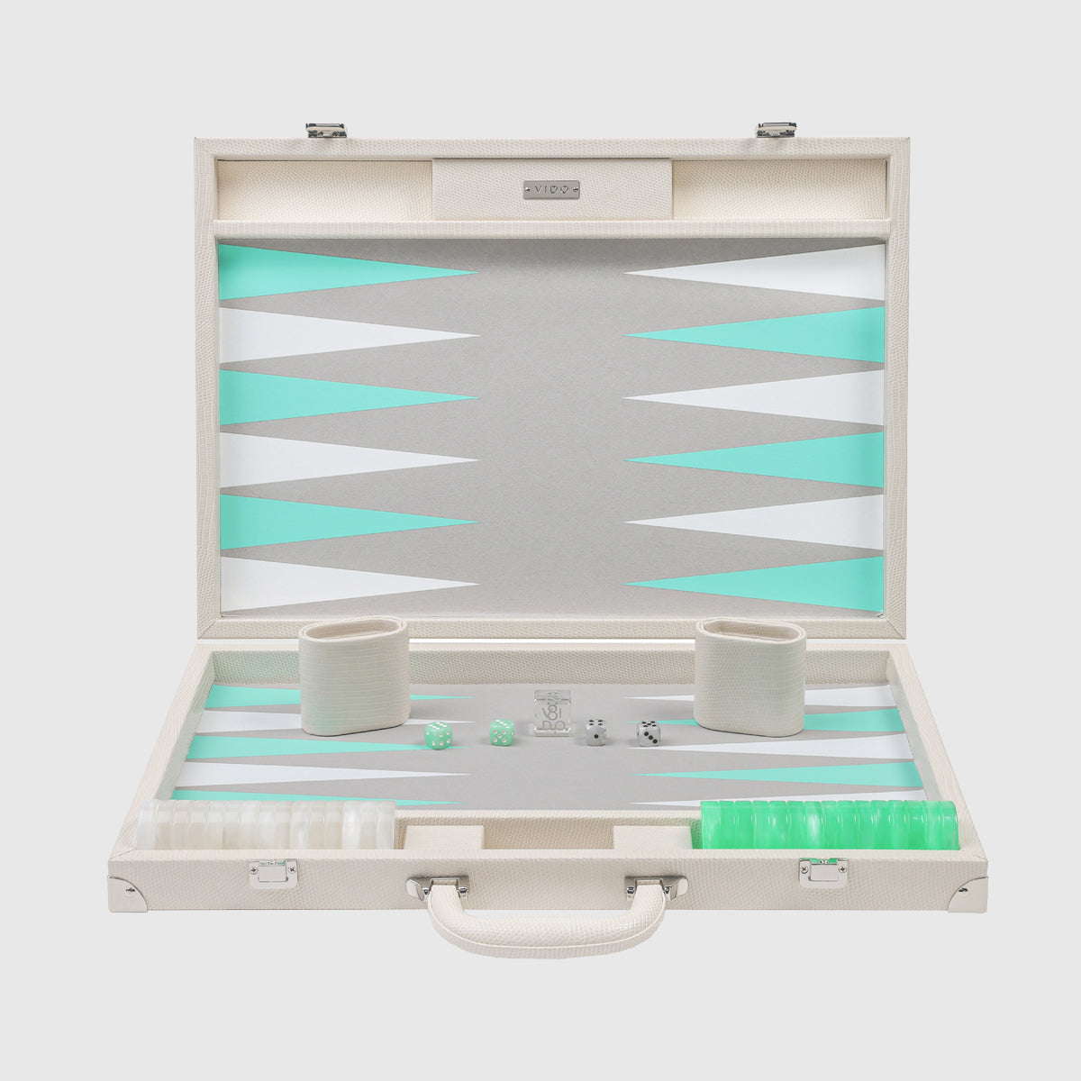 Our Pearl White backgammon set with Lizard pattern is carefully crafted with vegan leather, premium checkers and dice, and our signature VIDO doubling cube made of genuine crystal.