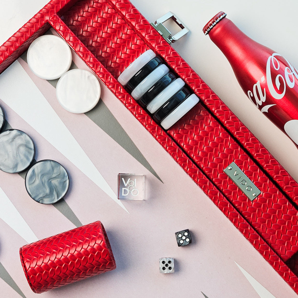 This Ruby Large Backgammon is a handmade masterpiece! With its vibrant ruby red colour, vegan leather, and classic braid pattern, no other game board looks quite like this one. This competition-sized board is also built to last with ethically sourced materials, so you'll be playing in style for years to come!