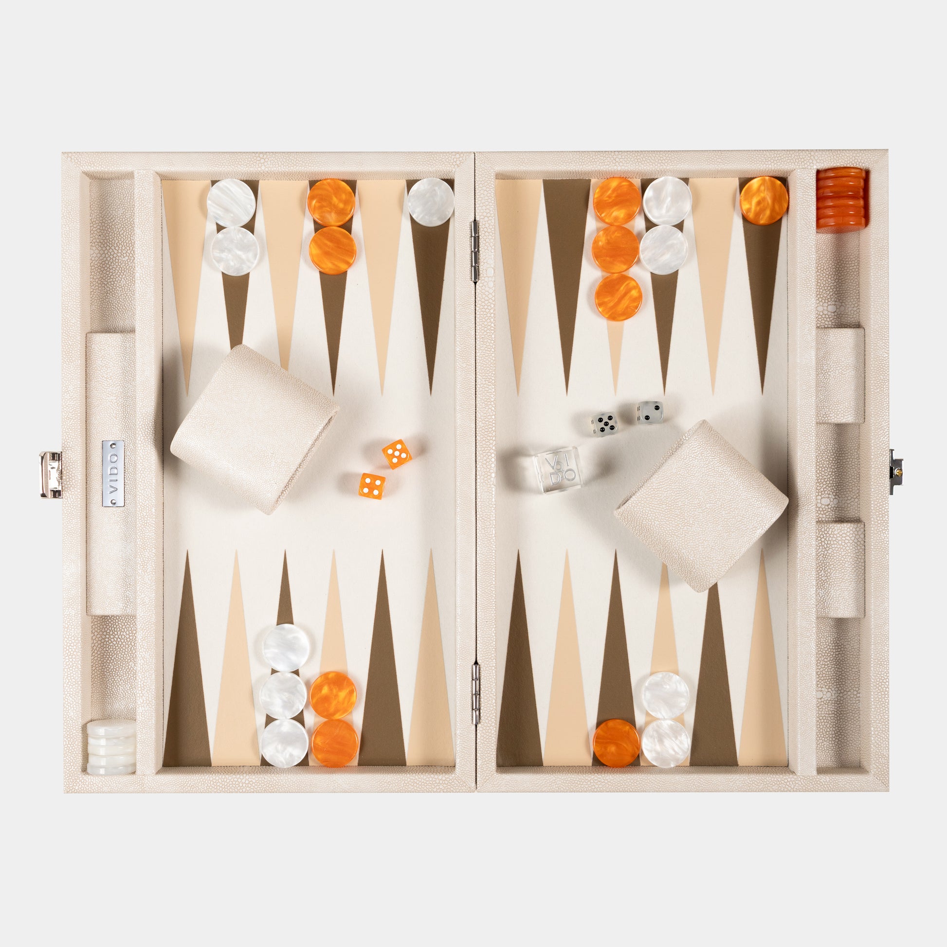 Designed for versatility, the Beige Stingray Medium Backgammon combines a smooth felt playing surface with stingray-textured vegan leather. Its balanced size makes it perfect for both home and travel, while the neutral beige finish delivers refined elegance in a modern, eco-conscious design.